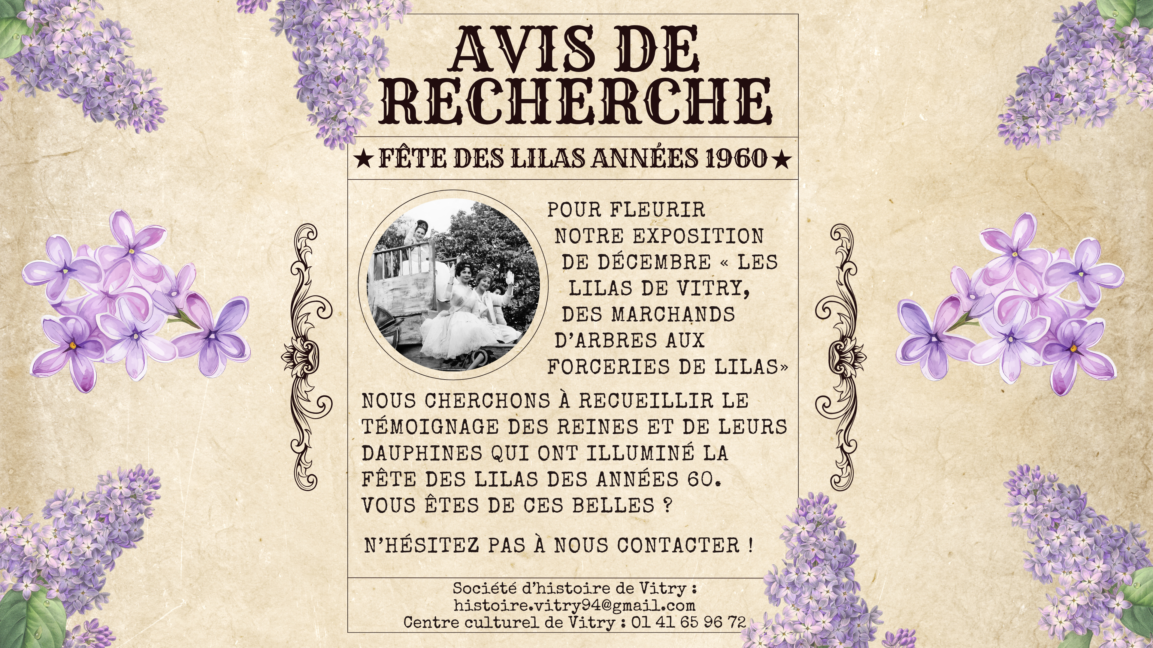 A l’occasion de son exposition à venir “Les Lilas de Vitry”, la Société d’Histoire de Vitry cherche à recueillir le témoignage des reines et de leurs dauphines qui ont illuminé…